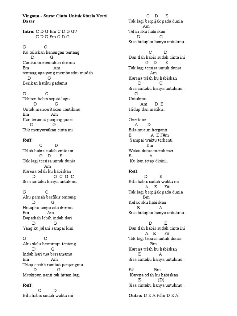 Chord Lagu Surat Cinta untuk Starla dari Last Child Lengkap dengan Lirik dan Terjemahan 18 Agustus 2022 0445 WIB. G A Dan tlah habis sudah cinta ini D A B Tak lagi tersisa untuk dunia Em Karena tlah kuhabiskan A D Sisa cintaku hanya untukmu.
